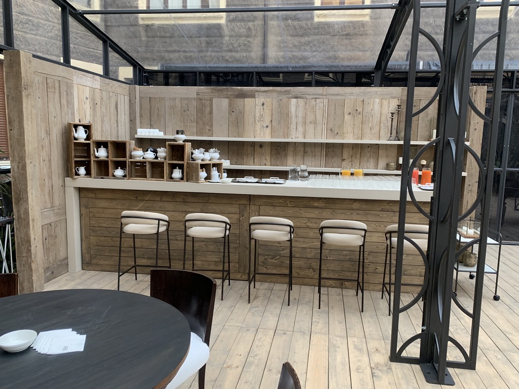 Le due versioni dei banconi si differenziano non solo per i toni di colore (grigio e naturale), ma anche per il tipo di legno utilizzato. Realizzazione di un particolare bancone bar con top e fianchi ad effetto "intonaco", della lunghezza cinque metri.